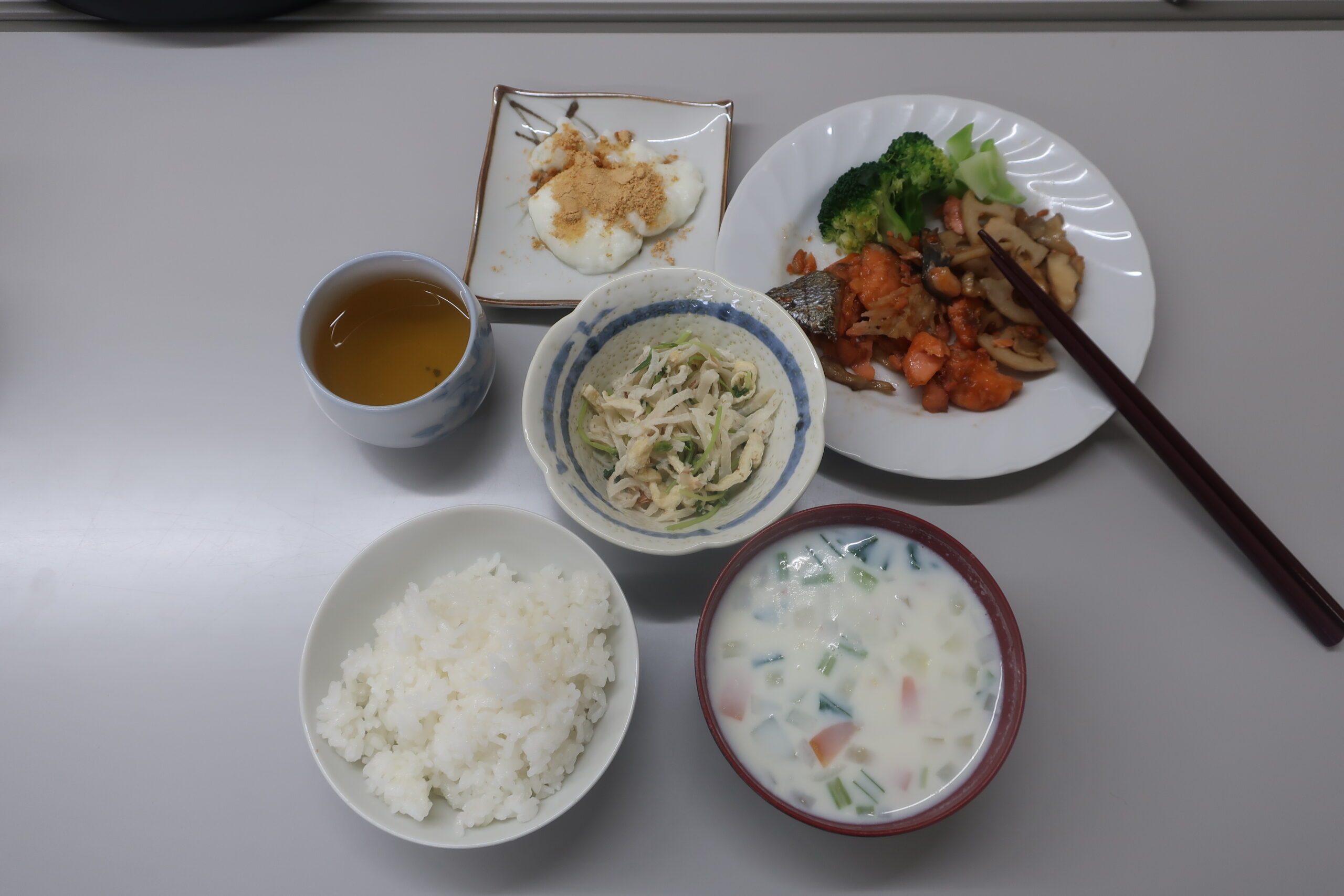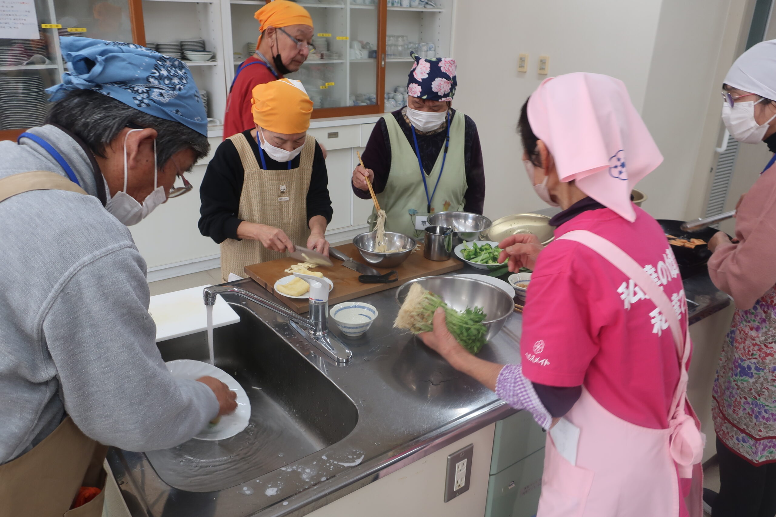 浜田市食生活改善推進協議会(以下、食改)の宮本会長にご講義をしていただき、各班に分かれて調理実習をしました。食改の皆さまが下準備をしていただいたので短時間で簡単においしく作ることができました。みんなで作ると楽しい!みんなで食べるとおいしい!「普段ひとりで食べてるからみんなで食べるとおいしい!」などの感想がありました。